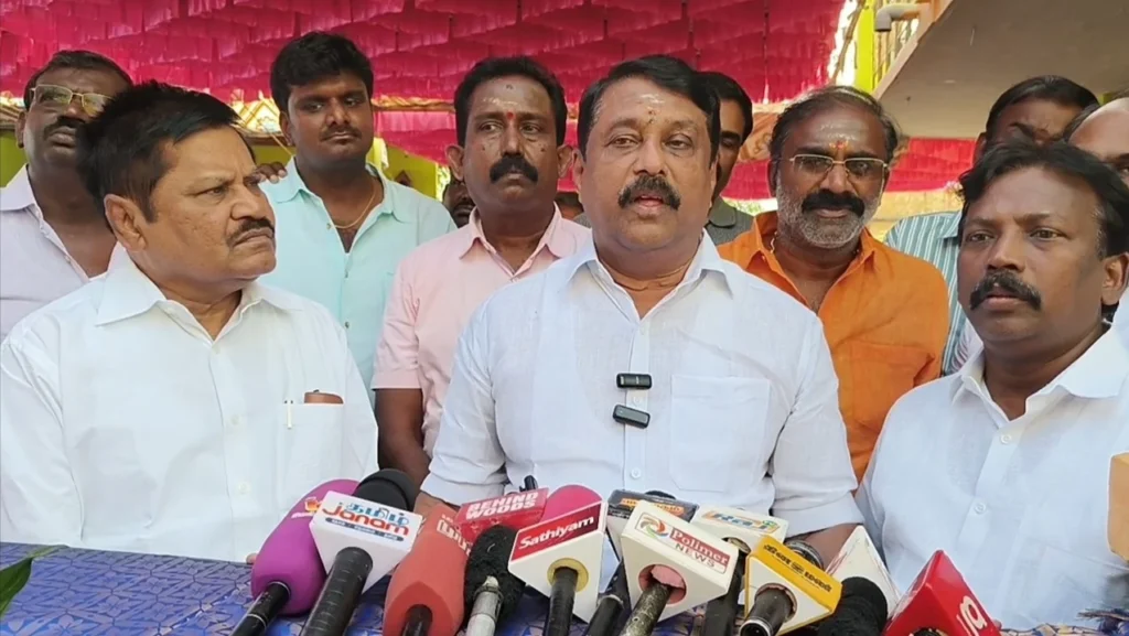 டிசம்பர் 21.2025 ; திருநெல்வேலி மாவட்டம் கரையிருப்பு பகுதியில் பாஜக வடக்கு மாவட்ட பொதுச் செயலாளர் நாகராஜன் இல்ல விழாவிற்கு வருகை தந்த பாஜக மாநிலத் தலைவர் நயினார் நாகேந்திரன், அங்கு செய்தியாளர்களைச் சந்தித்தார். அப்போது, திருநெல்வேலியில் முதல்வர் ஸ்டாலின் ஆற்றிய உரைக்குத் தக்க பதிலடி கொடுத்து அவர் பல்வேறு கருத்துக்களைப் பகிர்ந்து கொண்டார்.