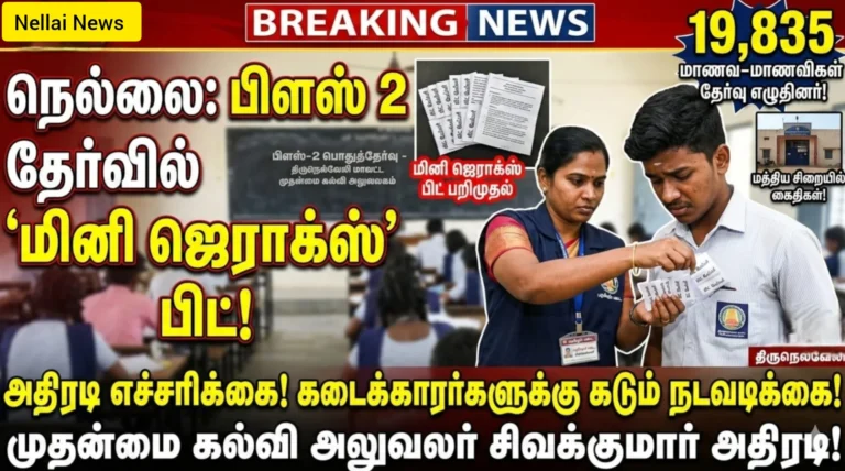 திருநெல்வேலி – மார்ச் 02, 2026; தமிழகம் முழுவதும் பிளஸ்-2 பொதுத்தேர்வு இன்று தொடங்கியது. நெல்லை மாவட்டத்தில் மொத்தம் 19,835 மாணவ-மாணவிகள் மிகுந்த உற்சாகத்துடன் தேர்வில் பங்கேற்றனர். இதற்காக மாவட்டம் முழுவதும் பலத்த பாதுகாப்பு…