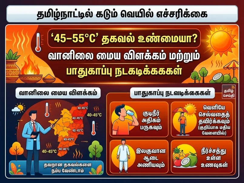 தமிழ்நாட்டில் 45–55°C வெப்பநிலை எச்சரிக்கை வைரலாகிறது. இது உண்மையா? IMD அதிகாரப்பூர்வ தகவல், வெப்ப அலை முன்னெச்சரிக்கை, மக்கள் கவனிக்க வேண்டியவை.